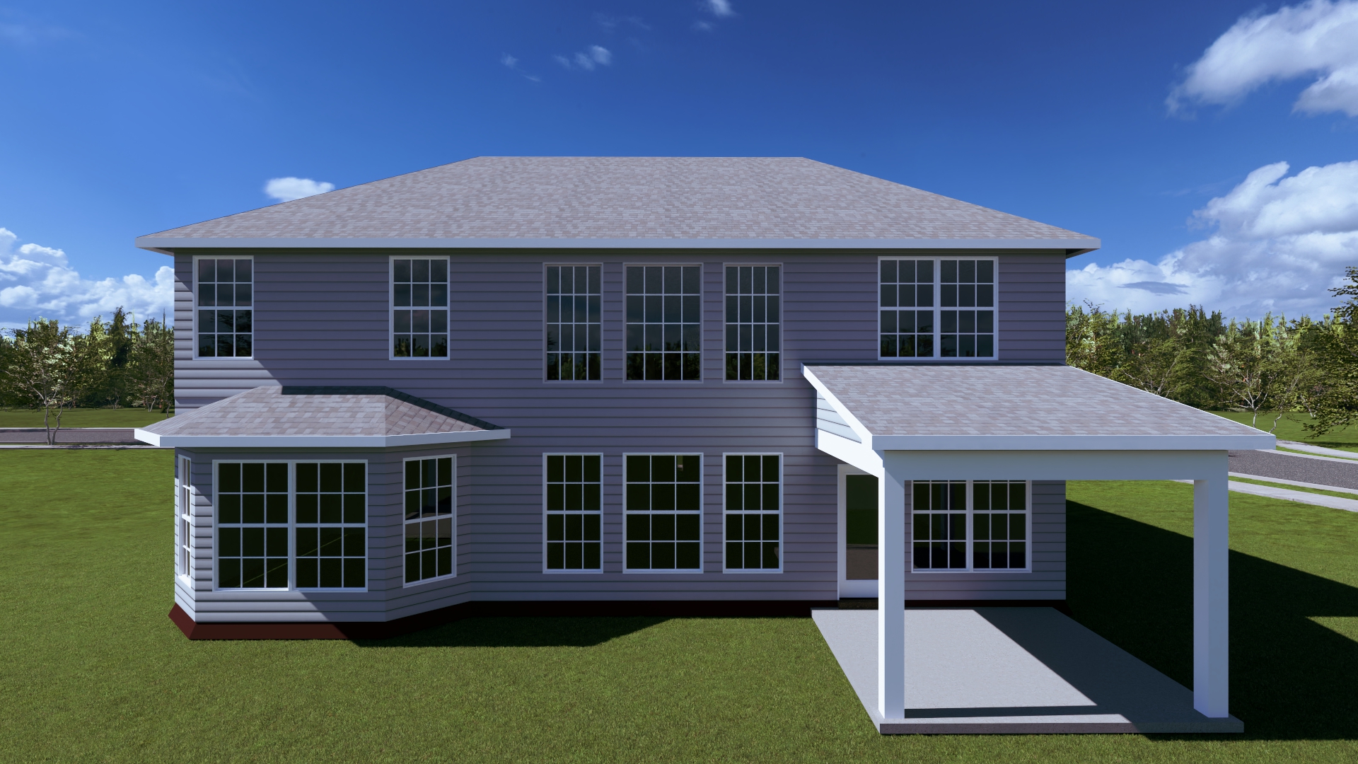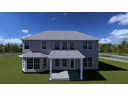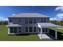 The family room has a two-story ceiling, two stories of windows overlooking the rear yard, and an optional inside chase fireplace with optional adjacent bookcase. A railed catwalk on the second floor overlooks the family room and two-story foyer.  Nine-foot ceilings are standard on the first floor.  The primary bedroom includes a trey ceiling and large bay window overlooking the rear yard.  A luxury bath is standard, and includes a garden tub, separate shower, and a double bowl vanity. The upstairs hall bath is designed for shared use, with a door between the vanity area and the tub/shower and commode area.  Both front elevations designs feature a covered entry and hip roof.