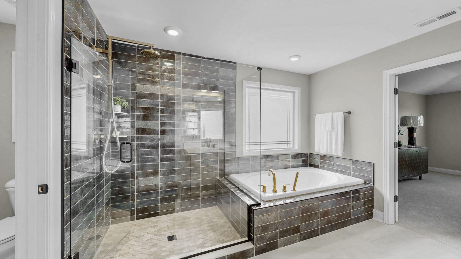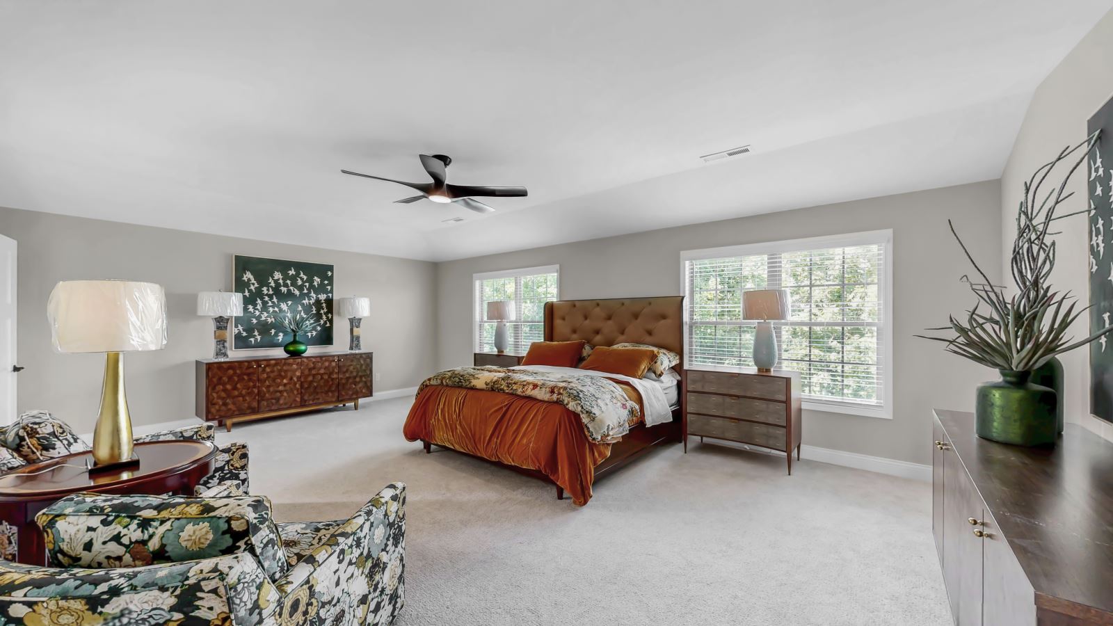 The large upstairs primary bedroom can be divided to create a separate sitting area. A luxurious bath with double bowl vanity, separate shower, and garden tub, plus a spacious closet, complete the primary suite.