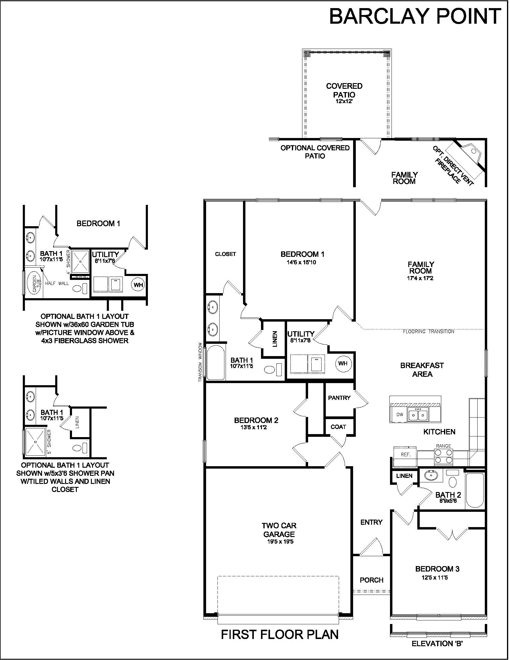 The Barclay Point, part of the Trend Collection by Ball Homes, is an open layout ranch plan with three bedrooms. This semi-split bedroom design places one bedroom and the hall bath off the entry, and the primary bedroom suite and additional bedroom on the other side of the home. The kitchen is at the heart of the home and offers both a breakfast area and countertop dining at the island. The kitchen opens to the family room at the rear of the home. The primary bedroom suite includes a bedroom with large closet and spacious bath with tub/shower, transom window, and linen storage. An upgrade primary bath offers a garden tub, separate shower, and picture window.