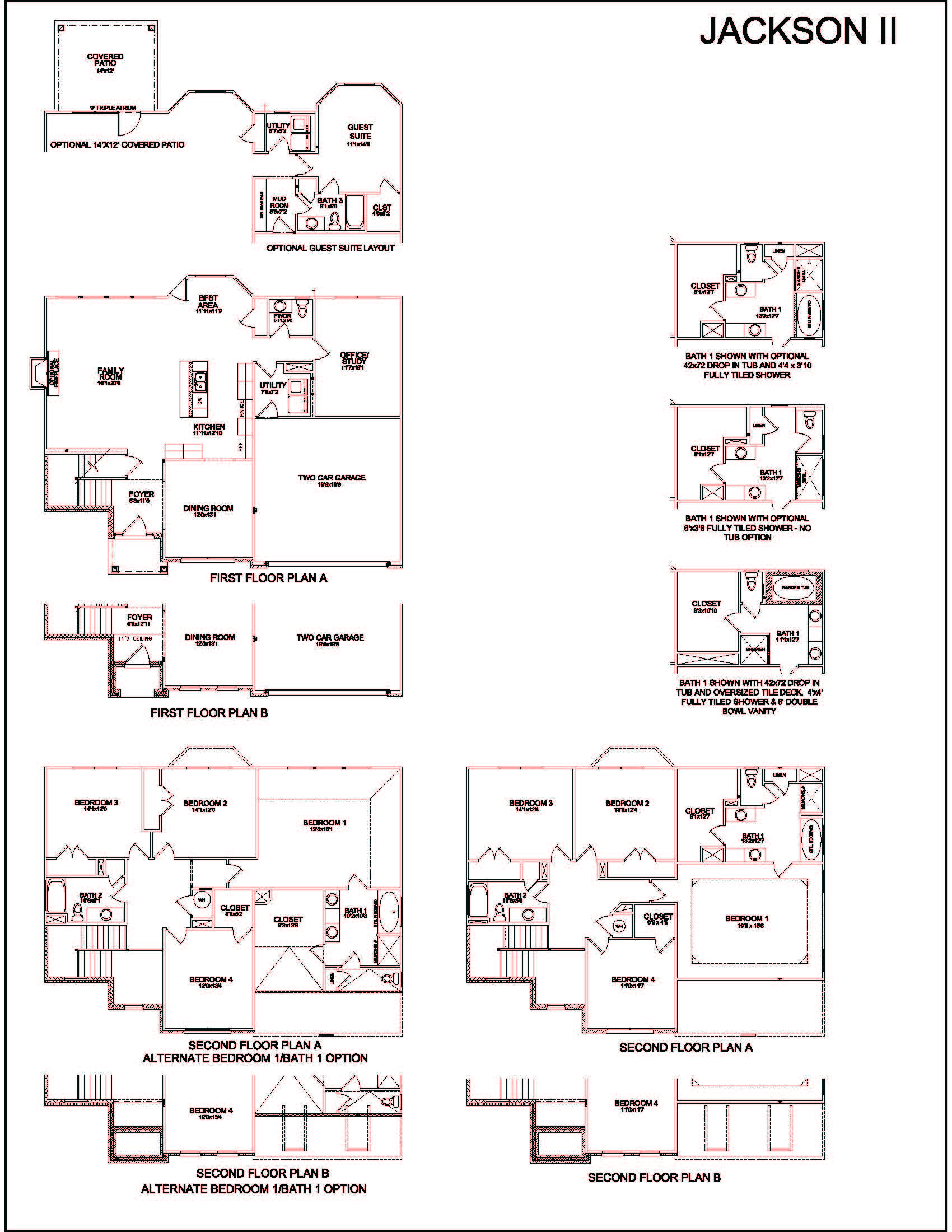 The Jackson II is a spacious four bedroom home with a downstairs office/study, which can also be configured as a guest suite with bay window. The two story foyer has a railed overlook above, and encompasses a stairway with a feature window over the landing. The family room and breakfast overlook the rear yard, and the centrally located kitchen is open to all main living areas of the home, for good traffic flow and entertaining. A large pass-through utility room/mudroom is on the first floor, and accesses a back hallway convenient to the powder room and kitchen. The office or study is located off this hallway, creating a nice combination of privacy and accessibility. When the optional guest suite replaces the office/study, a drop zone is also available leading from the garage to house. Nine foot ceilings throughout the first floor are included.