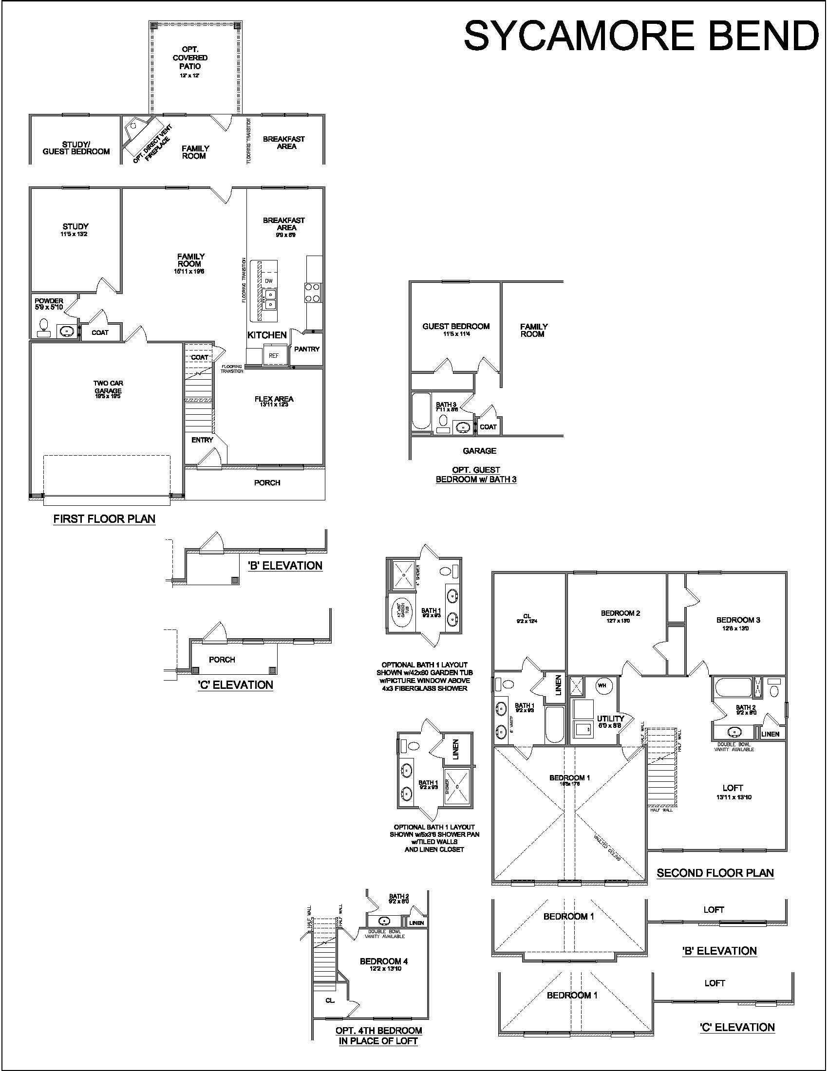 The Sycamore Bend, part of the Trend Collection by Ball Homes, is a two story plan that can be configured with up to five bedrooms, including a first floor guest bedroom. The plan offers a versatile flex room off the entry and an open kitchen and family room at the rear of the home. A study and half bath can be configured as an additional bedroom and full bath. The island kitchen offers both a breakfast area and countertop dining, and a pantry. Upstairs are the primary bedroom suite, two bedrooms, a loft and a hall bath. The loft can also be configured as an optional bedroom. The primary bedroom suite includes a bedroom with vaulted ceiling, huge closet, and spacious bath with tub/shower, window, and linen storage. An upgrade bath offers a garden tub, separate shower, and picture window.