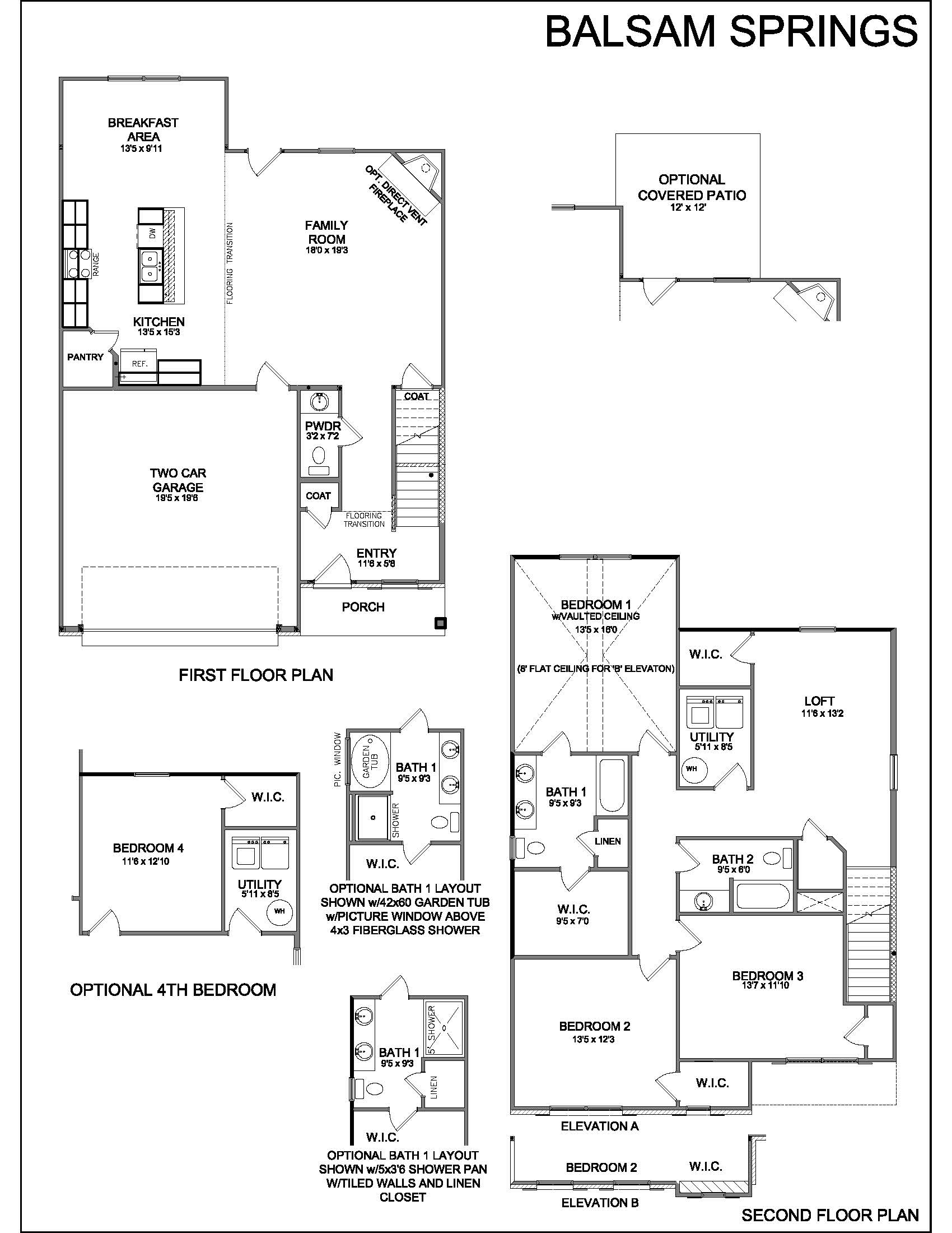 The Balsam Springs, part of the Trend Collection by Ball Homes, is a two-story plan with an open first floor layout and lots of second floor living space.  The kitchen and family room are open to each other, with an optional direct vent fireplace and covered patio possible.  The kitchen features a corner pantry, island with counter dining, and a spacious dining area with windows.Three bedrooms and a loft or optional fourth bedroom, two full baths, utility room,  and linen closet are all upstairs.  Bedroom 1 has a vaulted ceiling (Elevation A only), primary bath with dual vanity, tub/shower combination, and linen closet, opening to a large closet.   An upgrade primary bath offers a garden tub, separate shower, and picture window.  Exterior details include a covered front porch.