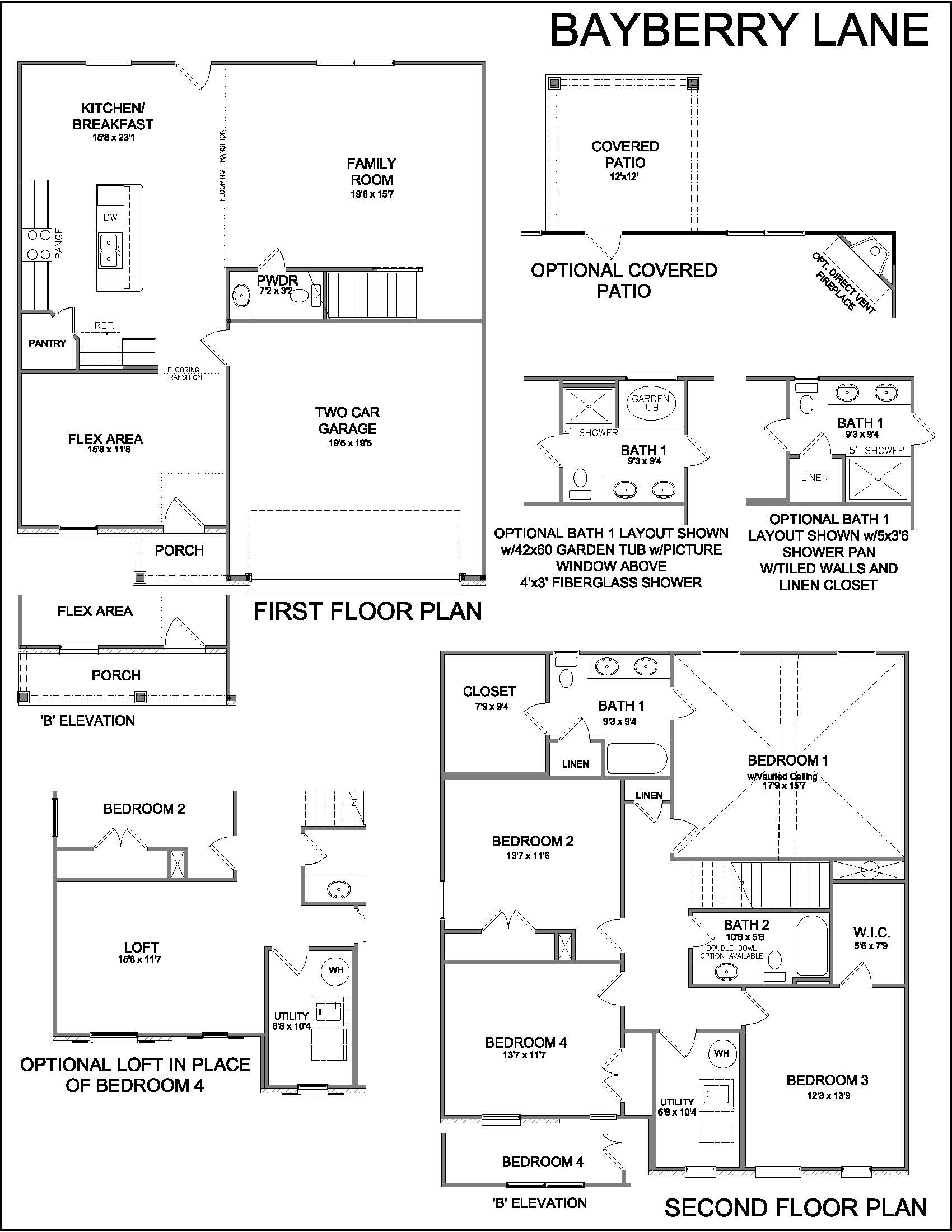 The Bayberry Lane, part of the Trend Collection by Ball Homes, is two story plan with a versatile flex room off the entry and a large open kitchen and family room at the rear of the home.  The island kitchen offers both a breakfast area and countertop dining, and a storage pantry.  Upstairs are the primary bedroom suite, three bedrooms and a hall bath. The fourth bedroom can also be configured a loft option. The primary bedroom suite includes a bedroom with vaulted ceiling, large closet, and spacious bath with tub/shower,  and linen storage.  An upgrade primary bath offers a garden tub, separate shower, and picture window.