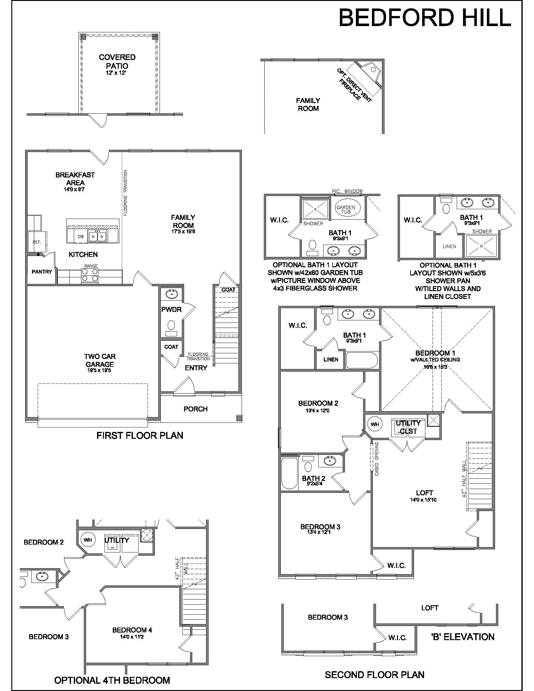The Bedford Hill, part of the Trend Collection by Ball Homes, is two story plan with a very open first floor layout. The island kitchen offers both a breakfast area and countertop dining, and a large pantry. The kitchen opens to the family room at the rear of the home. Upstairs are the primary bedroom suite, two bedrooms and a hall bath, plus a spacious loft that can also be configured as a fourth bedroom option. The primary bedroom suite includes a bedroom with vaulted ceiling, large closet, and spacious bath with tub/shower, and linen storage. An upgrade primary bath offers a garden tub, separate shower, and picture window.