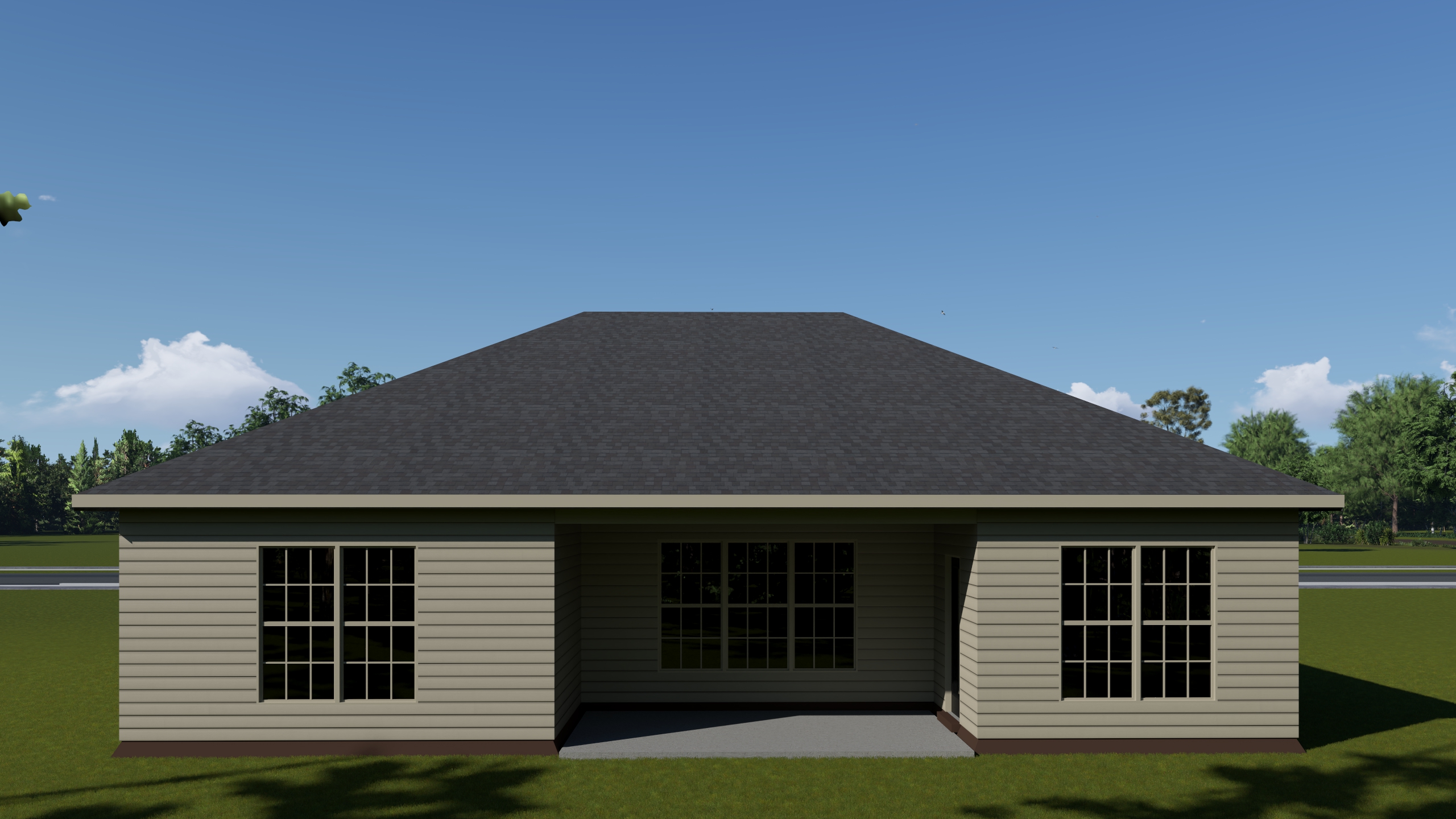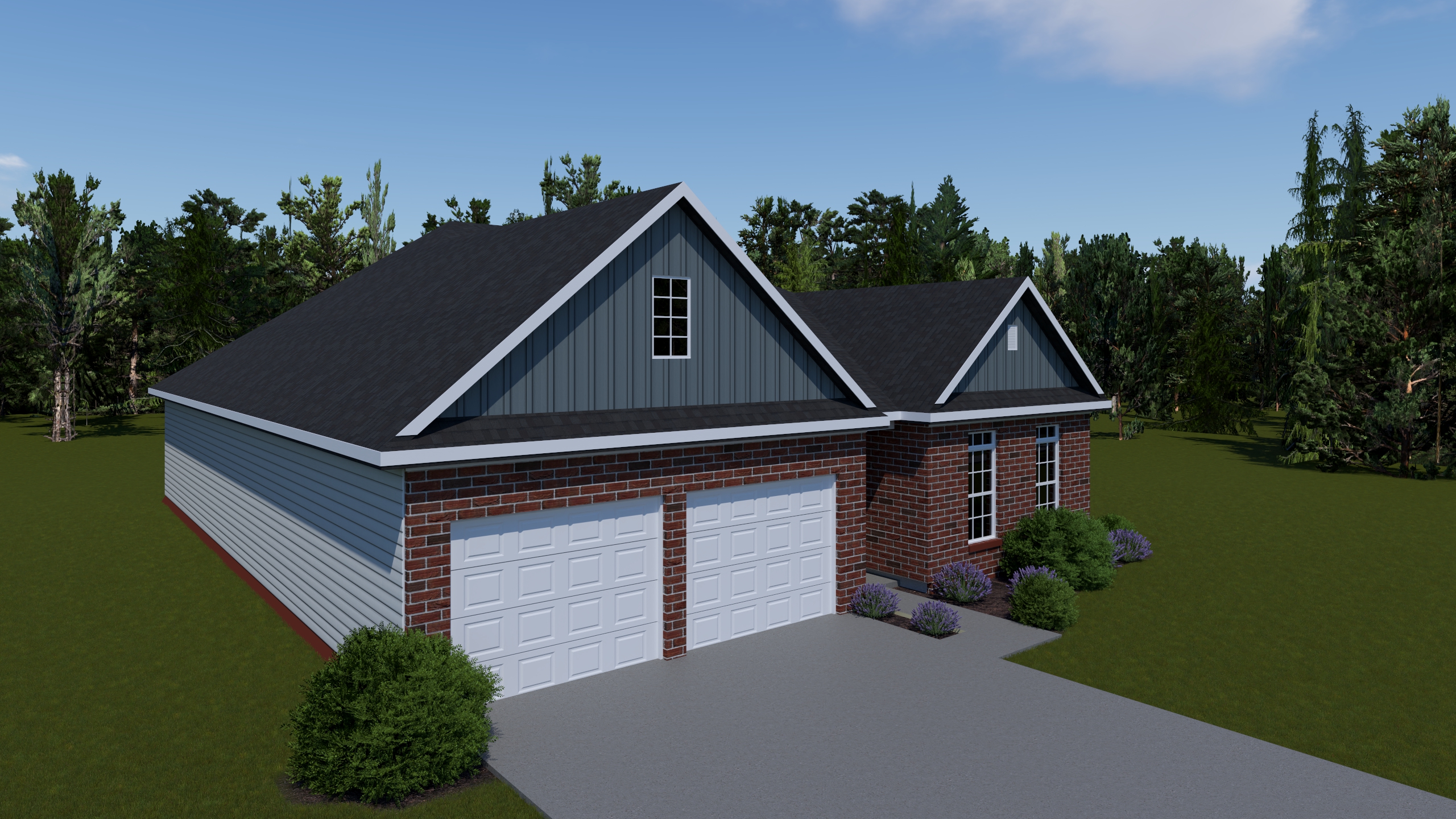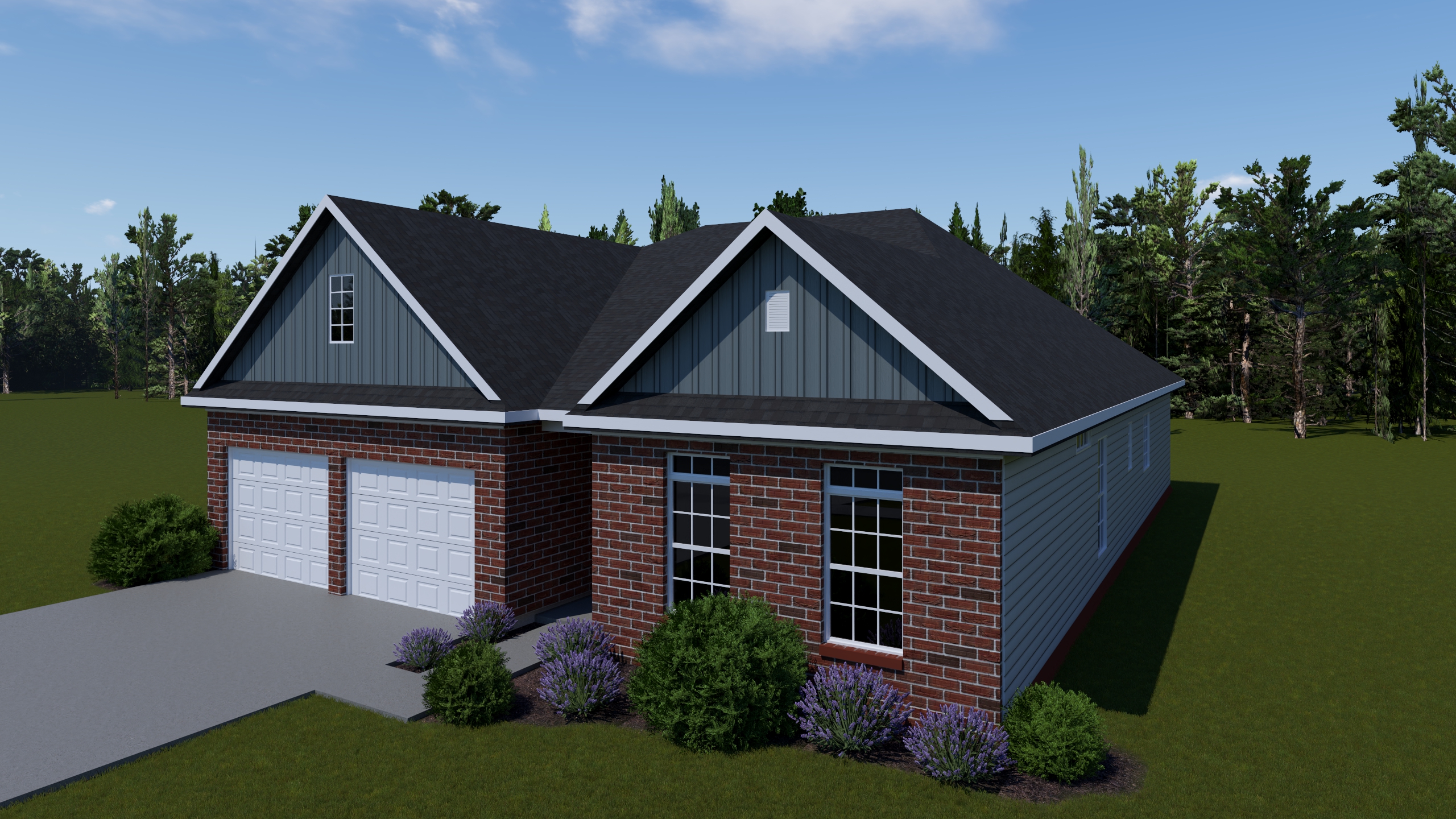 The Duncan has two front elevation options, both with hip roof designs, architectural gables above the garage, and transom windows.