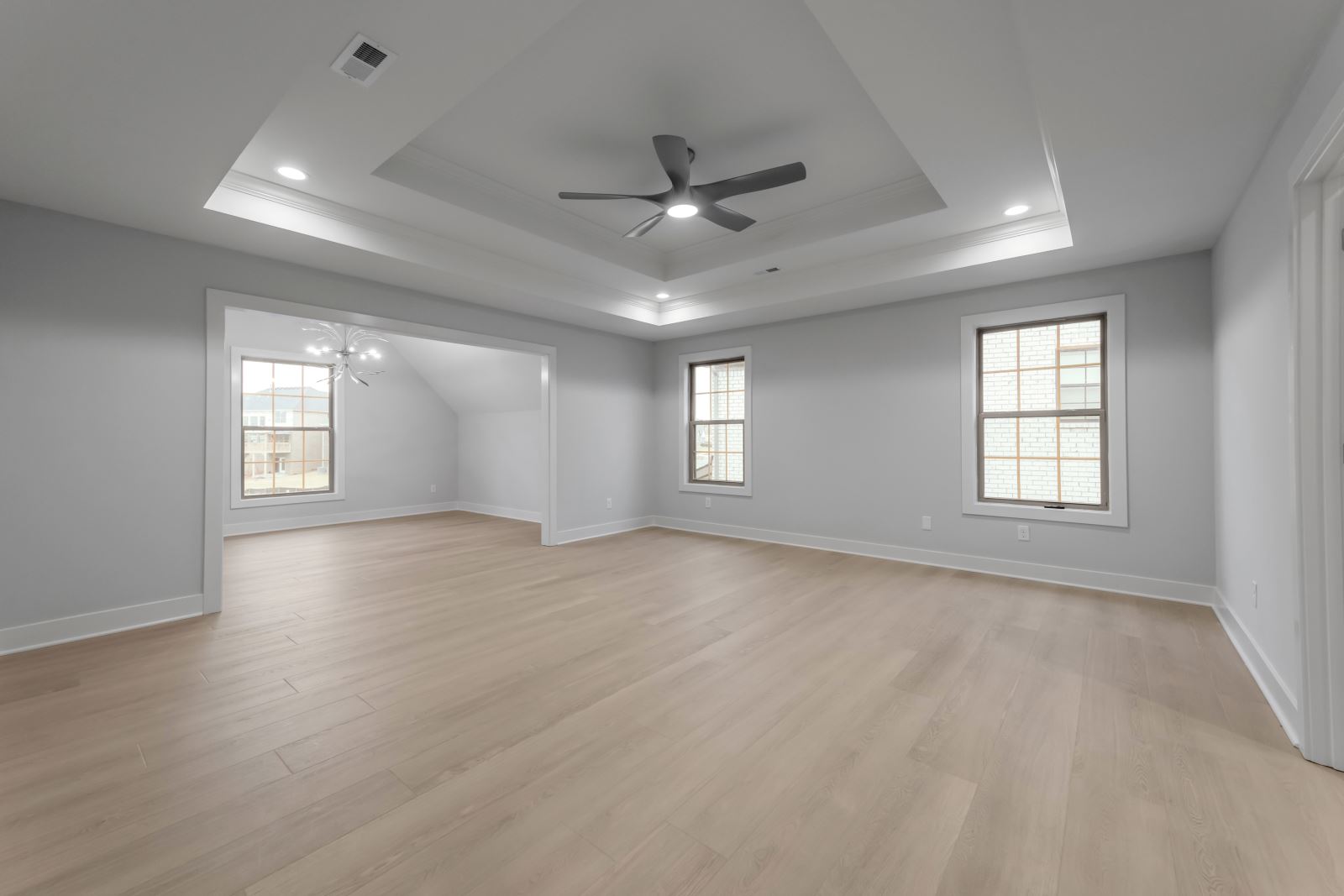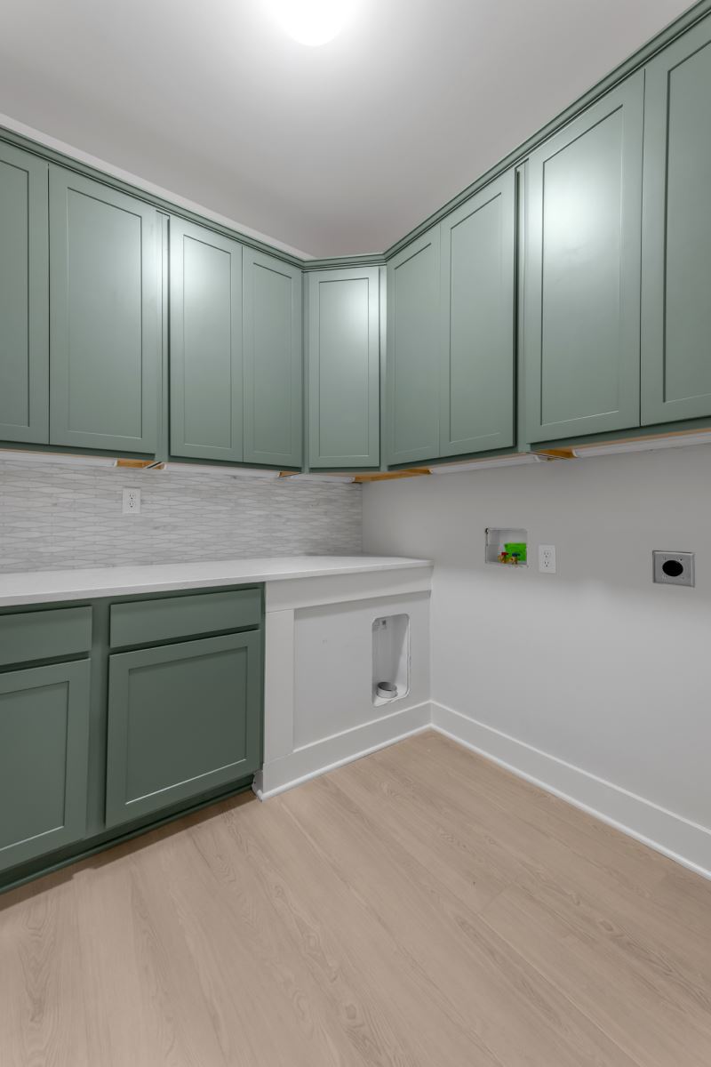 Upstairs bedrooms can be configured in several  ways, with four bedrooms as the standard layout.  The upstairs primary bedroom suite has a spacious separate sitting area, and double doors open to the bath, which includes dual walk-in closets, separate vanities, and a platform garden tub and oversized tiled shower.  An expanded layout with for bedrooms 2 and 3 with walk-in closets is offered.  The fourth bedroom has an option for an additional private full bath, or can be configured as a loft. An optional fifth bedroom and full bath can also be added in the second story space above the family room.