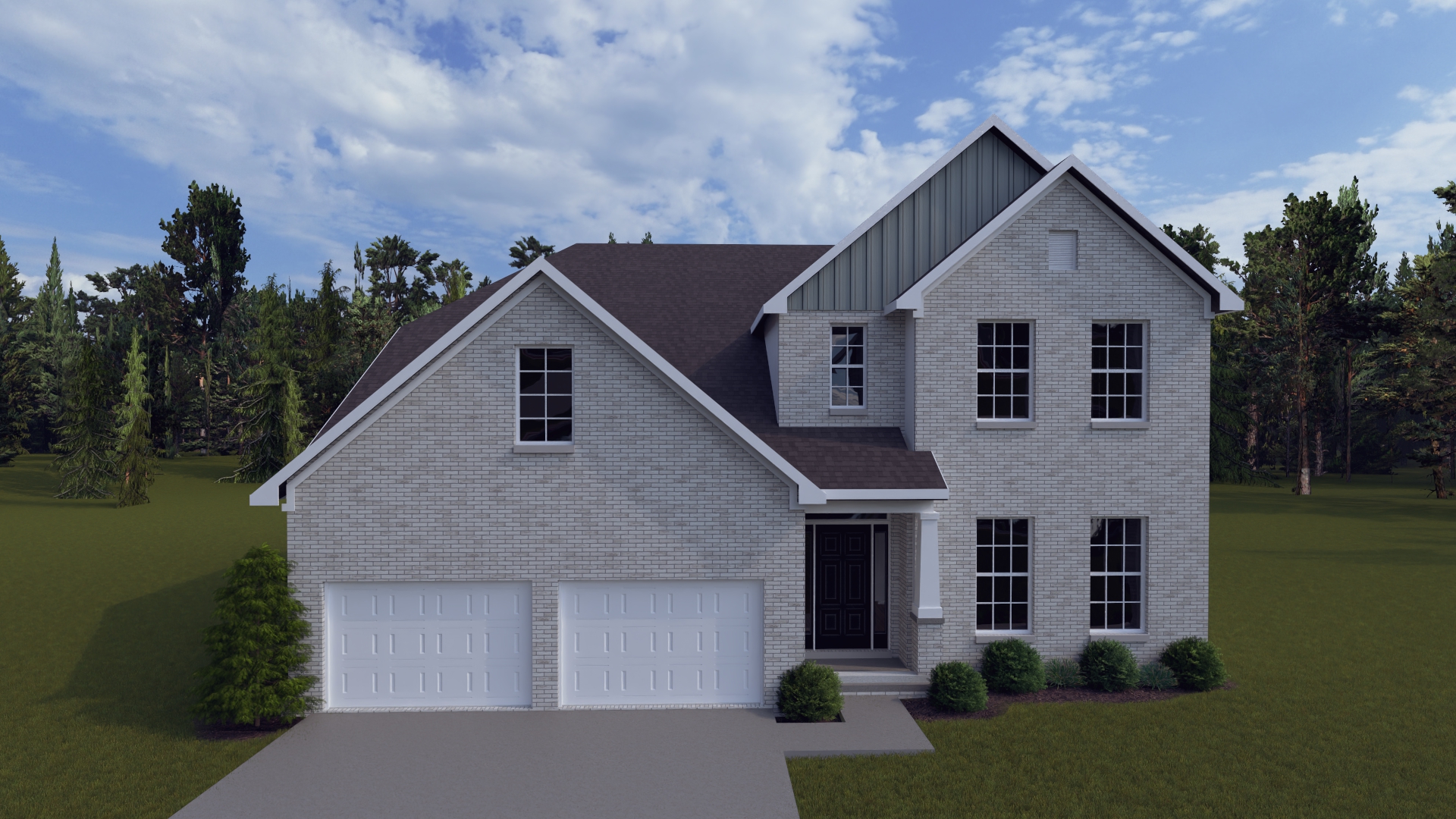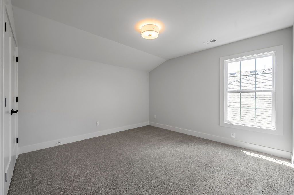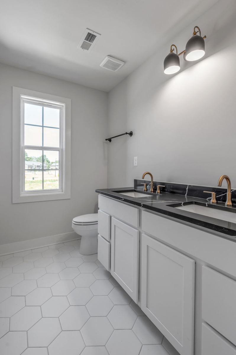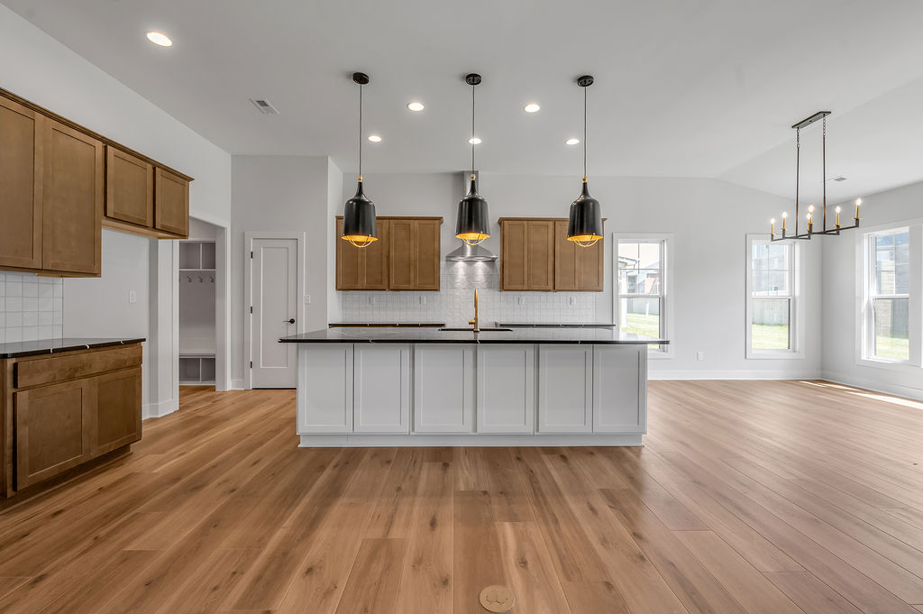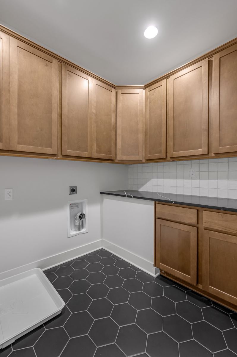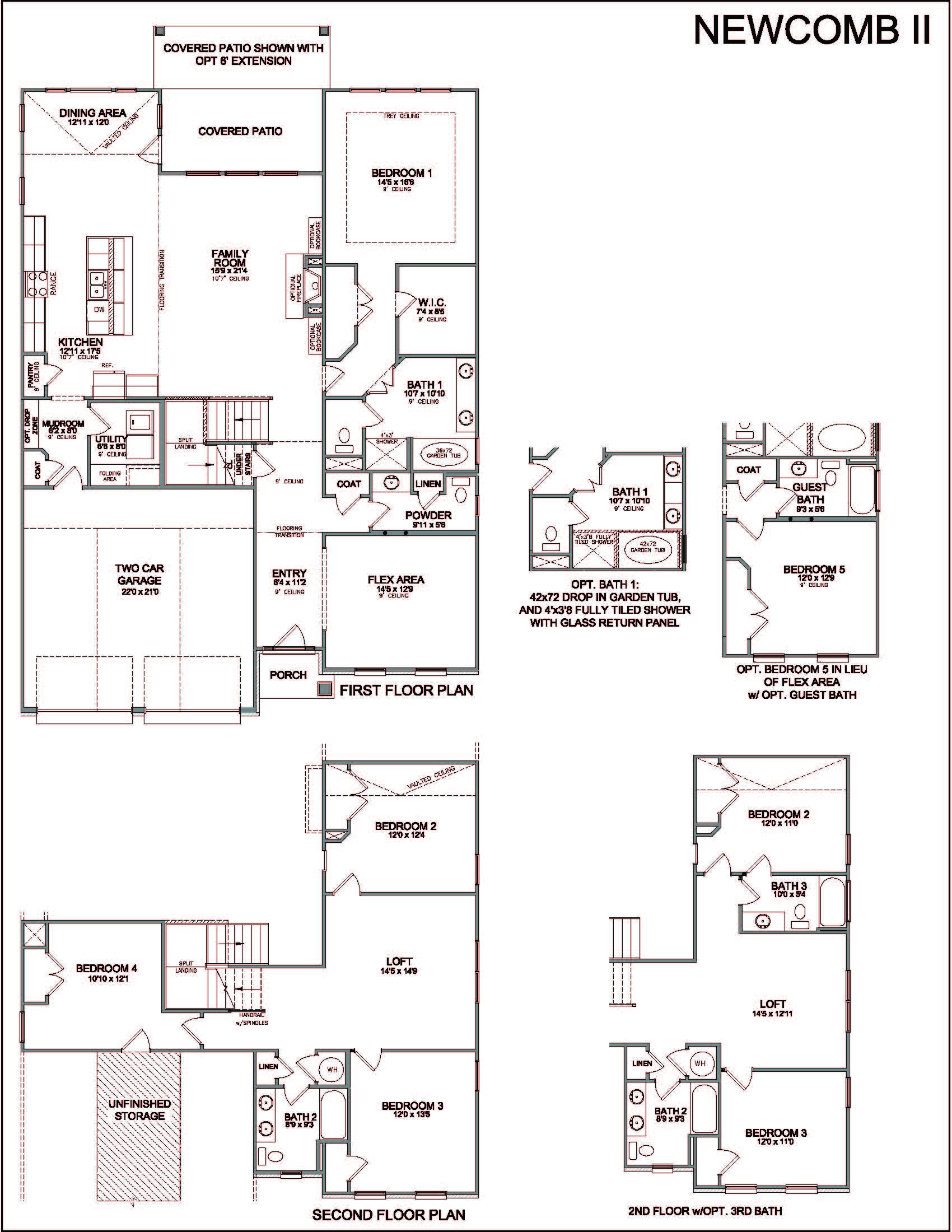 The Newcomb II is a traditional two-story home with a first floor primary bedroom plus three bedrooms, a loft, full bath, and unfinished storage area on the second floor. An additional full bath option is offered on the second floor. A large flex area off the entry can serve as an office or formal living area and can also be configured as a first-floor guest suite with full bath. A total of five bedrooms and four full baths are possible. The kitchen includes a pantry and island with counter dining, opening to the large central Family Room. A dedicated dining area off the kitchen overlooks the rear yard with a feature window and vaulted ceiling. A mudroom with optional drop zone connects the garage to the kitchen, as well as the separate utility room with built in folding counter. The first floor primary bedroom suite is a spacious retreat, with dual vanity, commode closet, walk-in closet, and garden tub and separate shower. Nine foot ceilings are standard on the first floor with ceilings over 10' in the kitchen and family room, and a vaulted dining area. Exterior details include a hip roof and rear covered patio with optional 6’ extension.