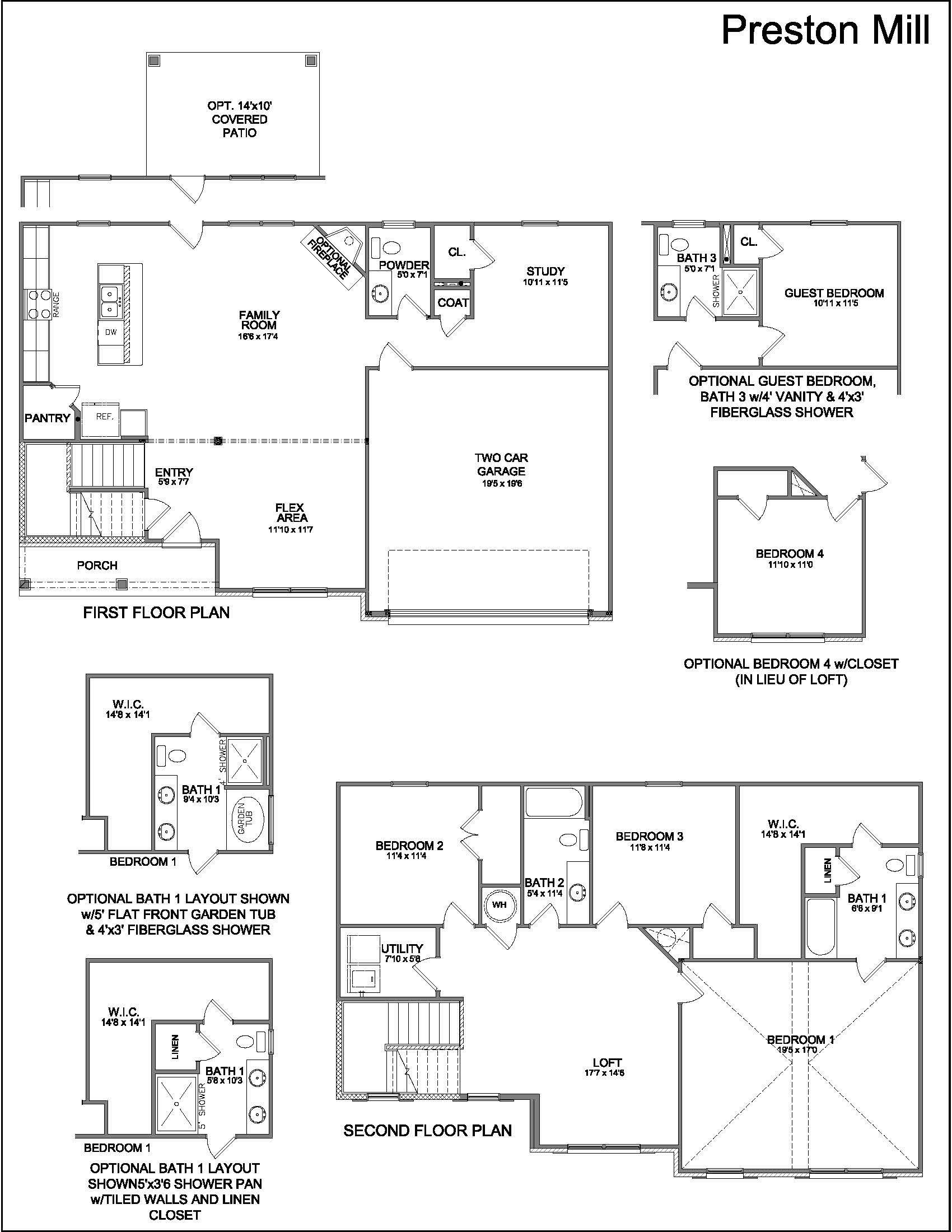 The Preston Mill, part of the Trend Collection by Ball Homes, is a two-story plan that can be built with a total of five bedrooms, including a first floor guest suite. The plan offers a versatile flex room off the entry and an open kitchen. The island kitchen has both a breakfast area and countertop dining, and a pantry. The large family room is located at the rear of the home with an optional fireplace. The study and half bath can also be configured as a first floor guest bedroom and bath with shower. Upstairs are the primary bedroom suite, two bedrooms, and a loft. The loft can also be designed as an additional bedroom. The primary bedroom suite includes a bedroom with a vaulted ceiling, huge walk-in closet, and spacious bath with tub/shower, window, and linen storage. Upgrade bath options include a garden tub and separate shower, or an oversized shower and expanded linen storage. The hall bath and utility room complete the upstairs. Exterior details include a covered front porch.