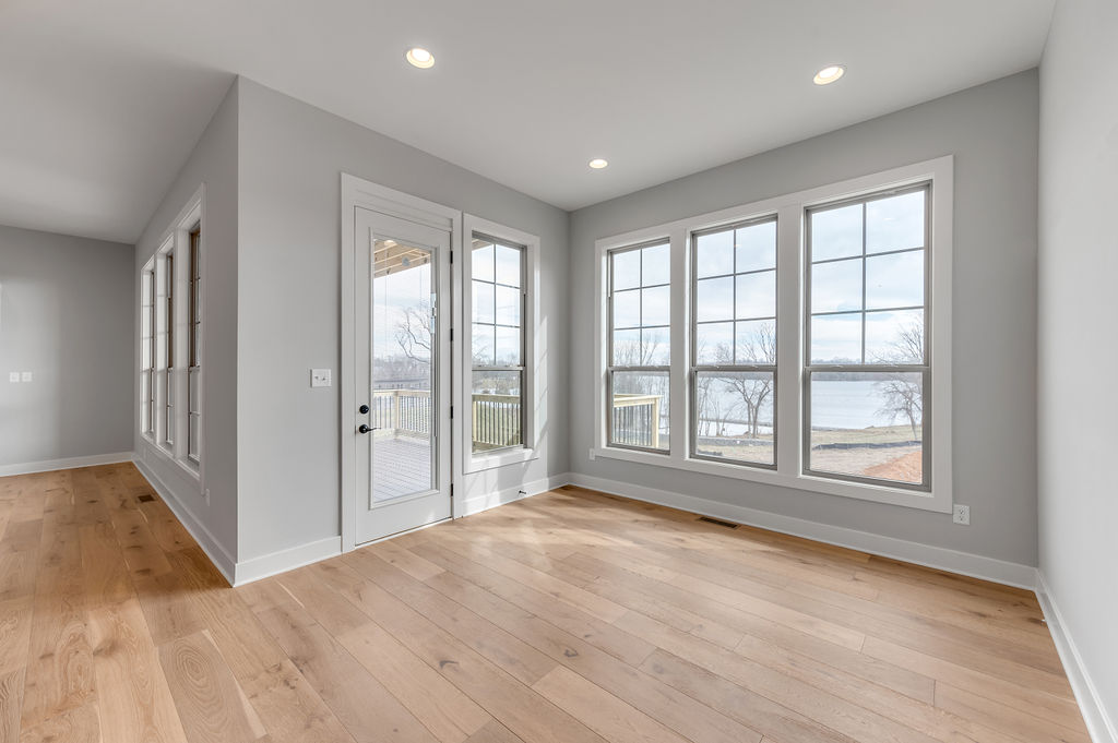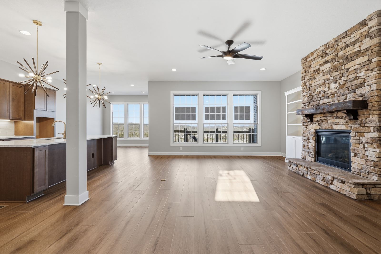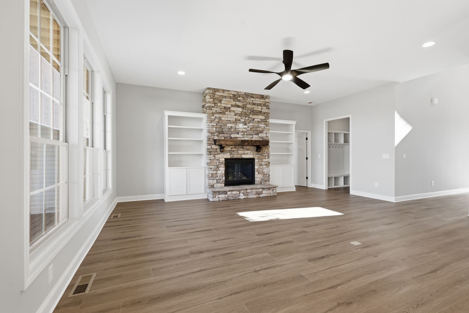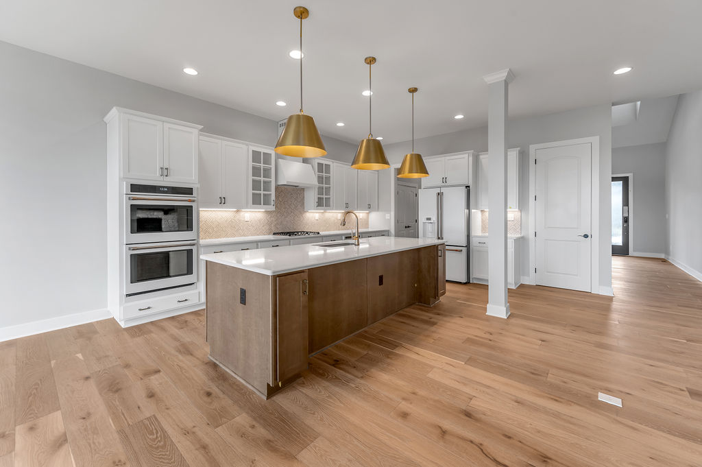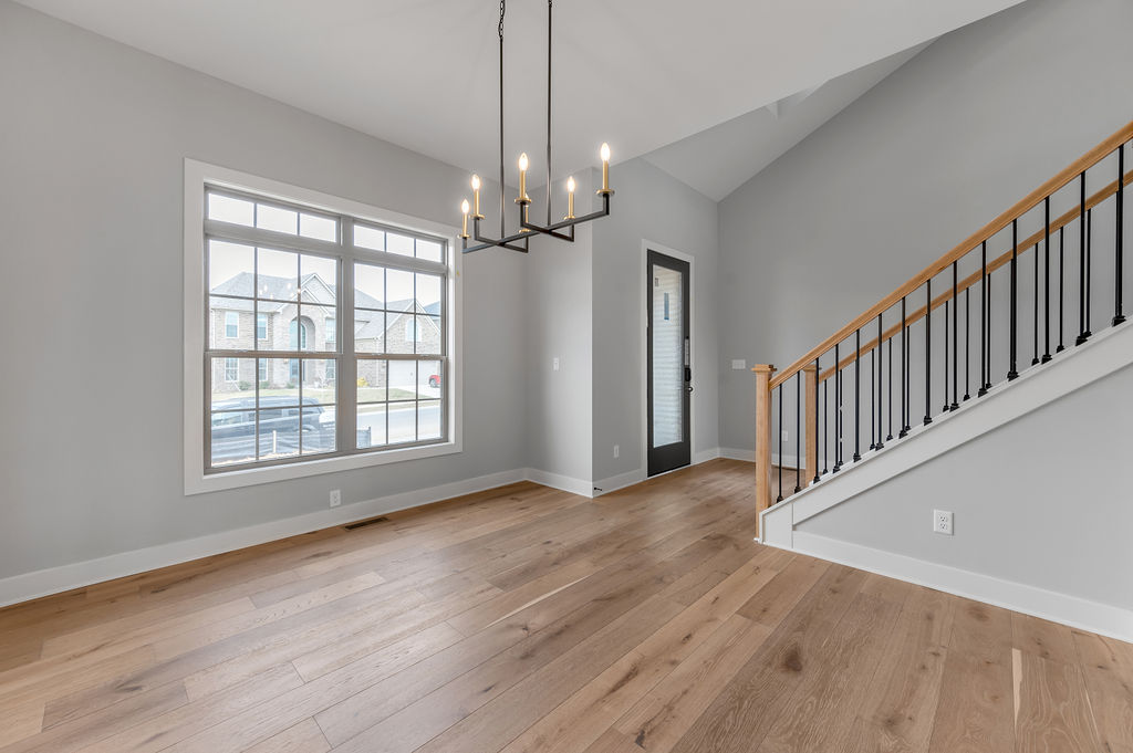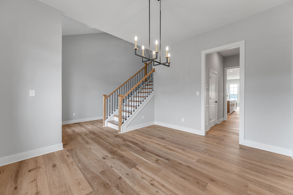 The Stockton offers a very open first floor layout with a large family room and flex area off the entry than can be utilized as a formal sitting area, home office, or more.  The family room with optional bookcases and fireplace is open to the kitchen which makes this plan ideal for entertaining.  Kitchen features include an island design and separate breakfast area, and adjoins the flex room via a hallway with a built-in butler’s pantry and separate utility room with folding counter.  The first-floor primary bedroom suite includes a large walk-in closet and linen closet, a garden tub, separate shower, and 6' double bowl vanity in the primary bath.  A covered patio with covered deck above is included at the rear of the home and sheltered by the first-floor primary bedroom and breakfast area wings of the house for maximum privacy. The garage opens to a mud room, powder room, and optional drop zone off the family room.  Three additional bedrooms, two full bath and a large central loft are located upstairs, with access to the spacious covered deck.  A 10’ wide unfinished attic storage is accessible from bedroom #3.