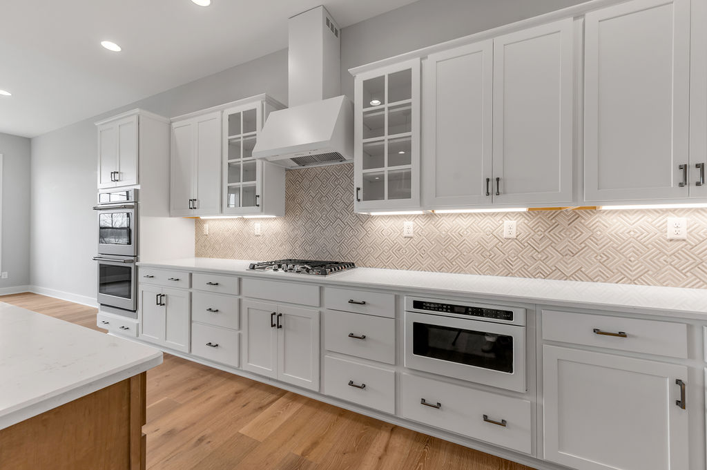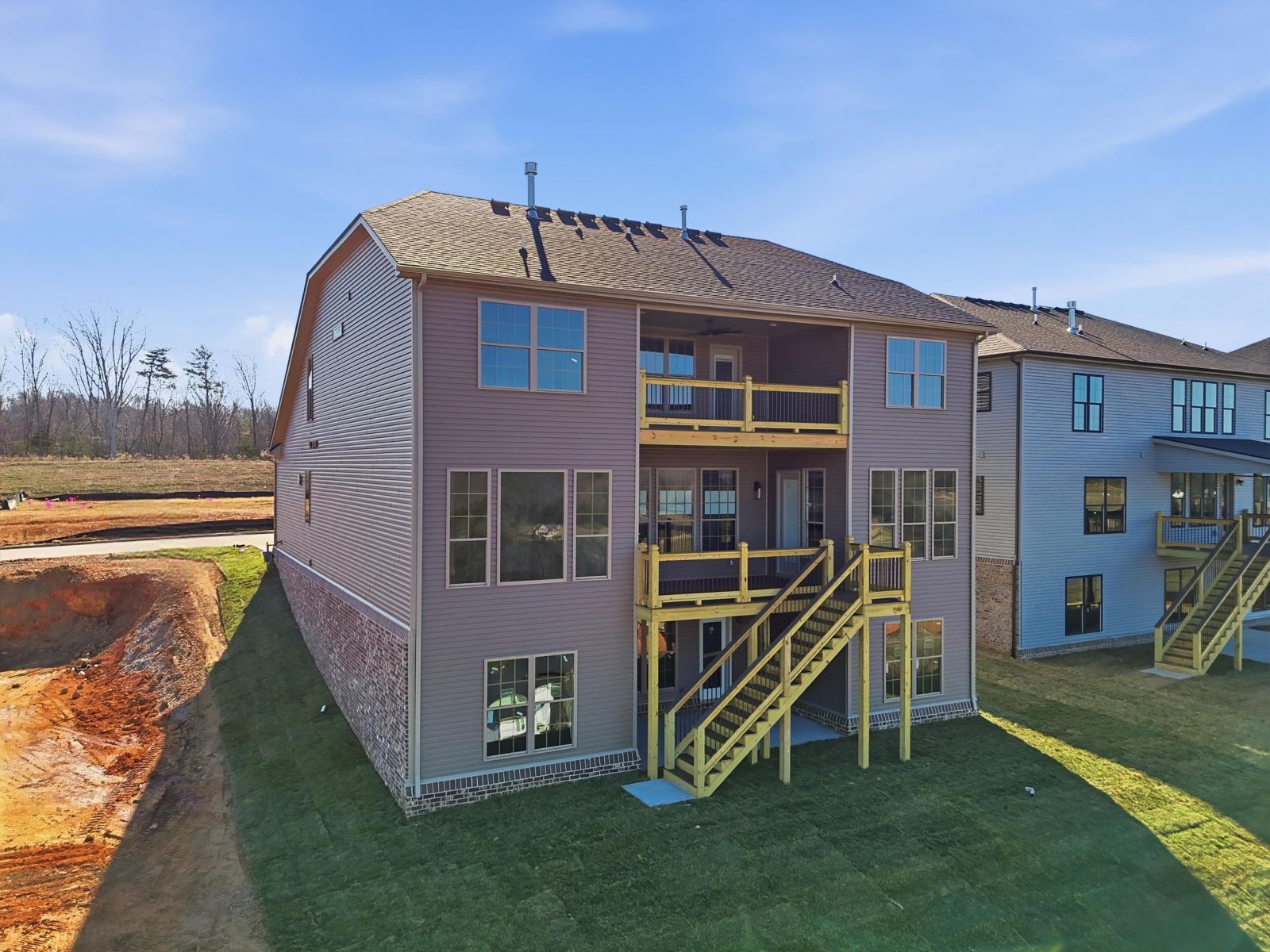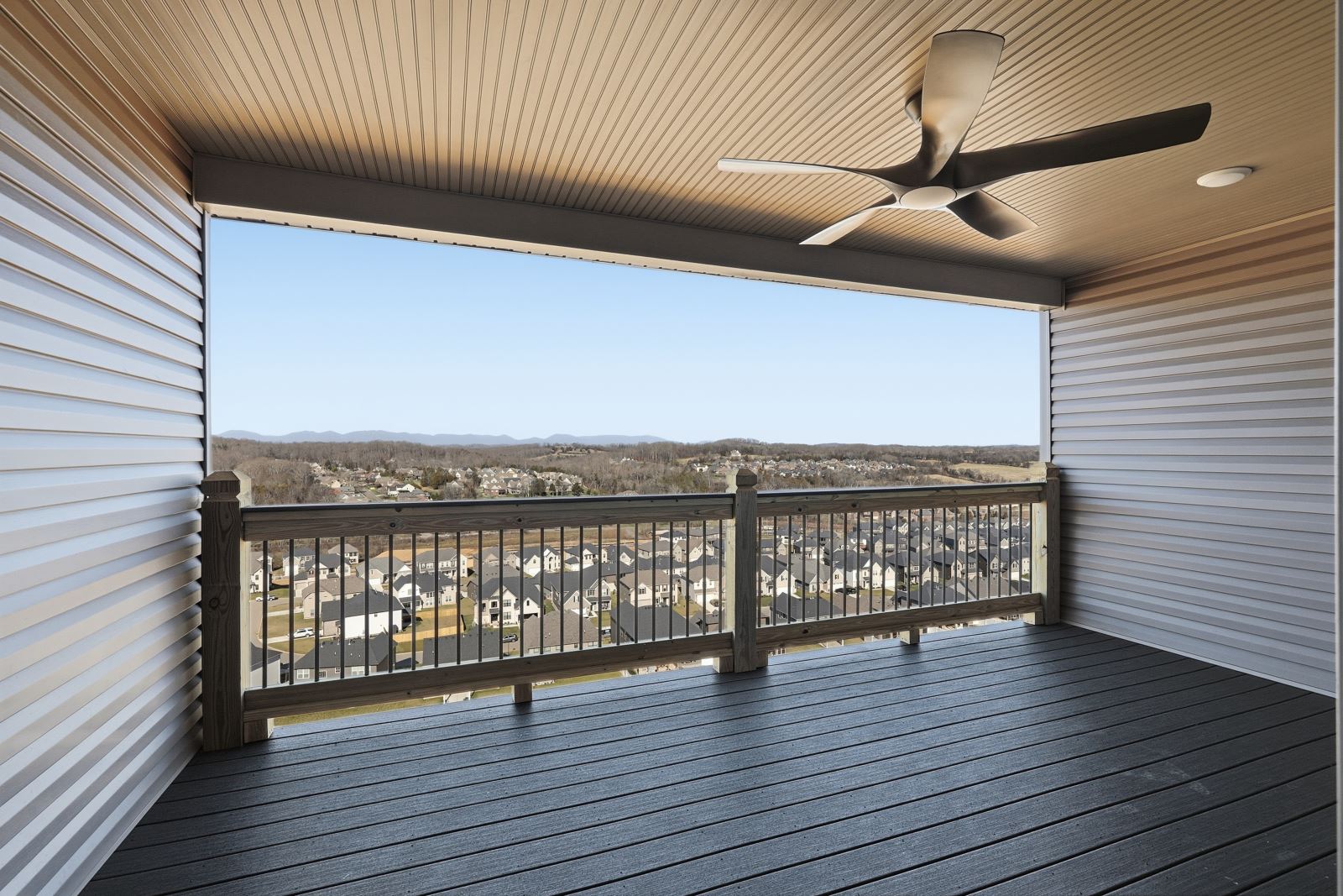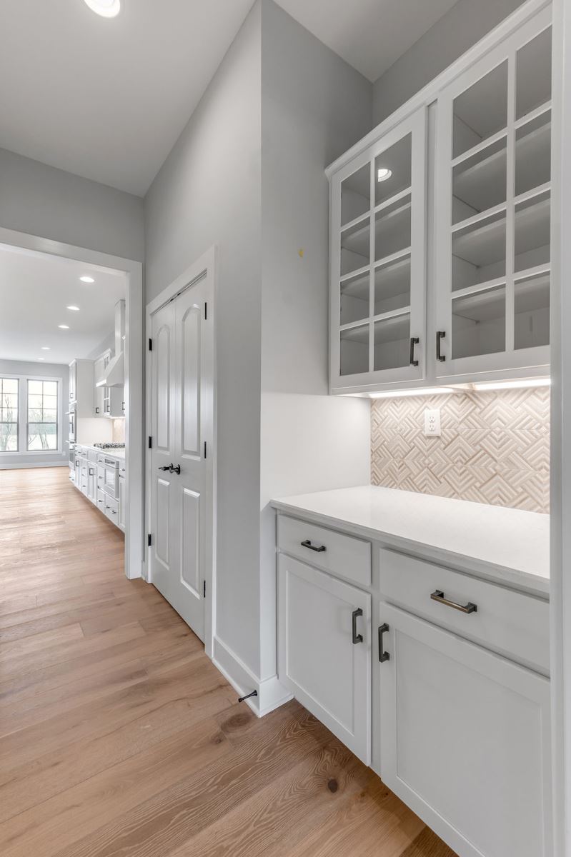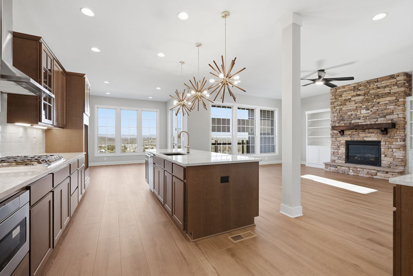 The Stockton offers a very open first floor layout with a large family room and flex area off the entry than can be utilized as a formal sitting area, home office, or more.  The family room with optional bookcases and fireplace is open to the kitchen which makes this plan ideal for entertaining.  Kitchen features include an island design and separate breakfast area, and adjoins the flex room via a hallway with a built-in butler’s pantry and separate utility room with folding counter.  The first-floor primary bedroom suite includes a large walk-in closet and linen closet, a garden tub, separate shower, and 6' double bowl vanity in the primary bath.  A covered patio with covered deck above is included at the rear of the home and sheltered by the first-floor primary bedroom and breakfast area wings of the house for maximum privacy. The garage opens to a mud room, powder room, and optional drop zone off the family room.  Three additional bedrooms, two full bath and a large central loft are located upstairs, with access to the spacious covered deck.  A 10’ wide unfinished attic storage is accessible from bedroom #3.