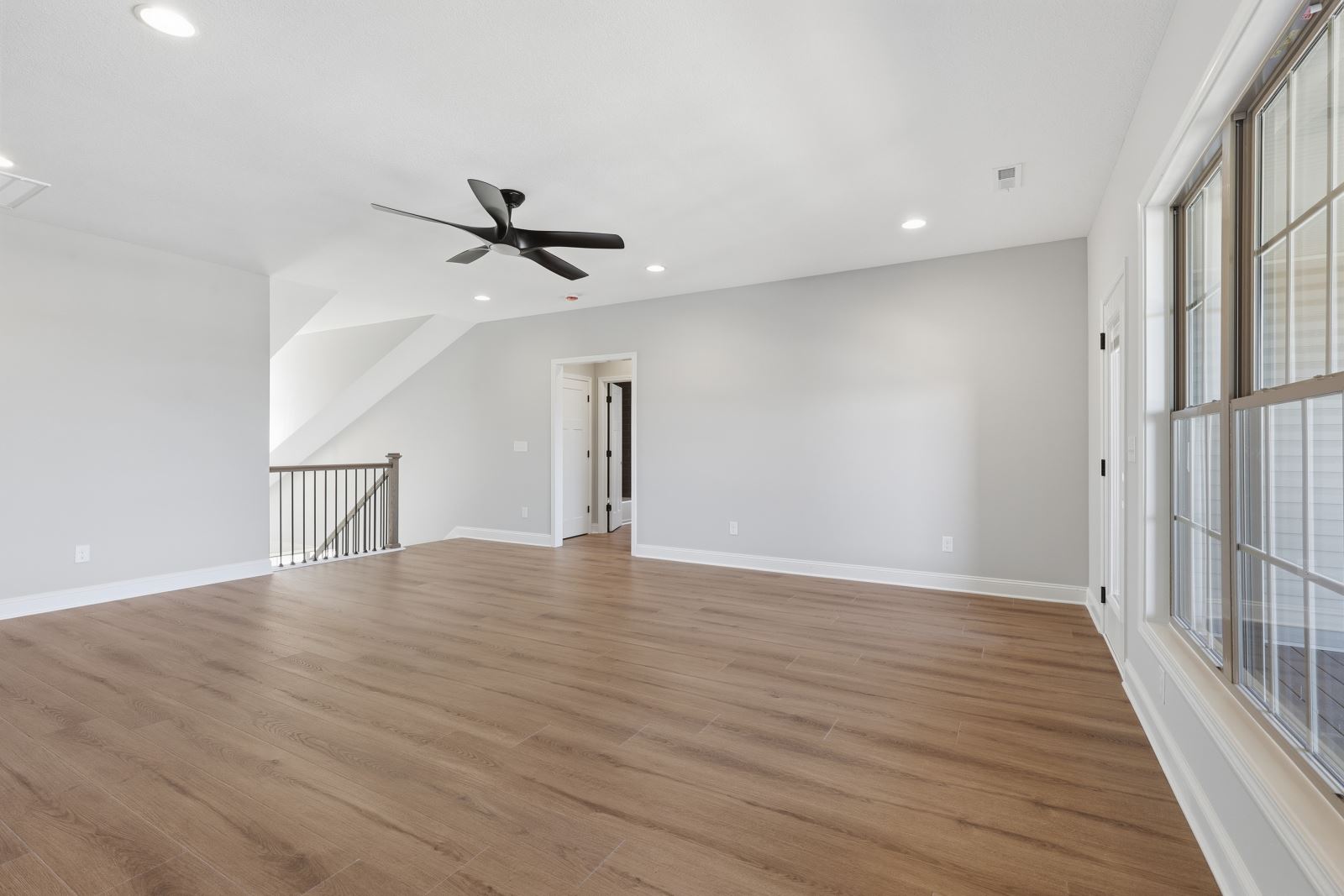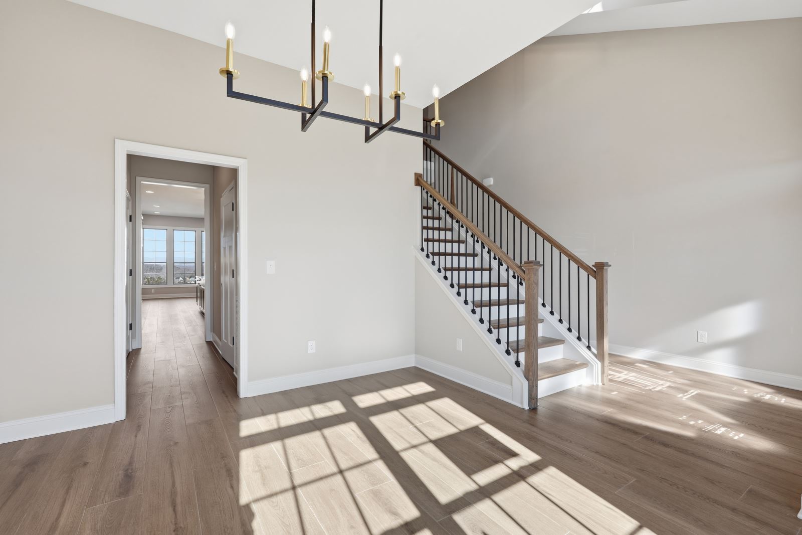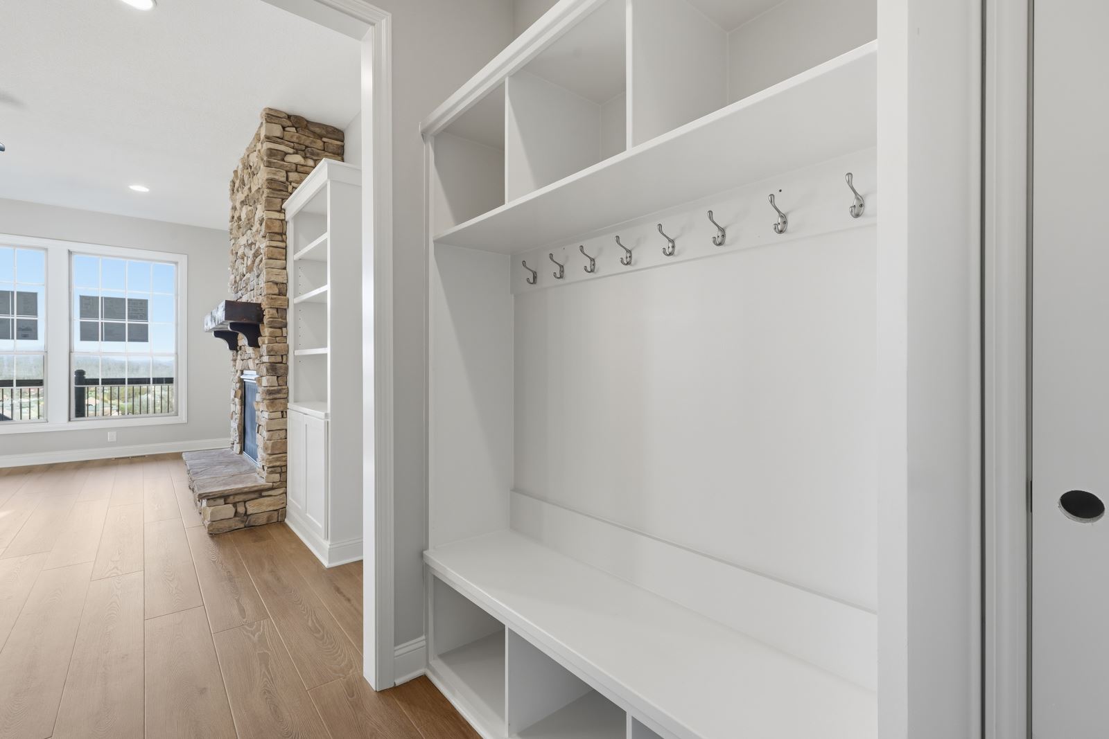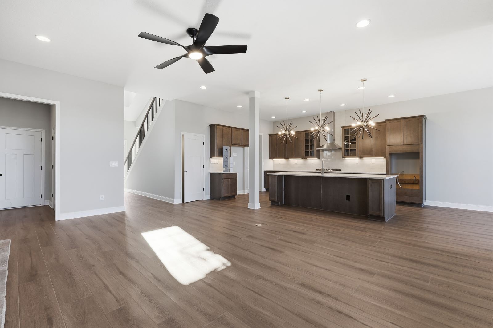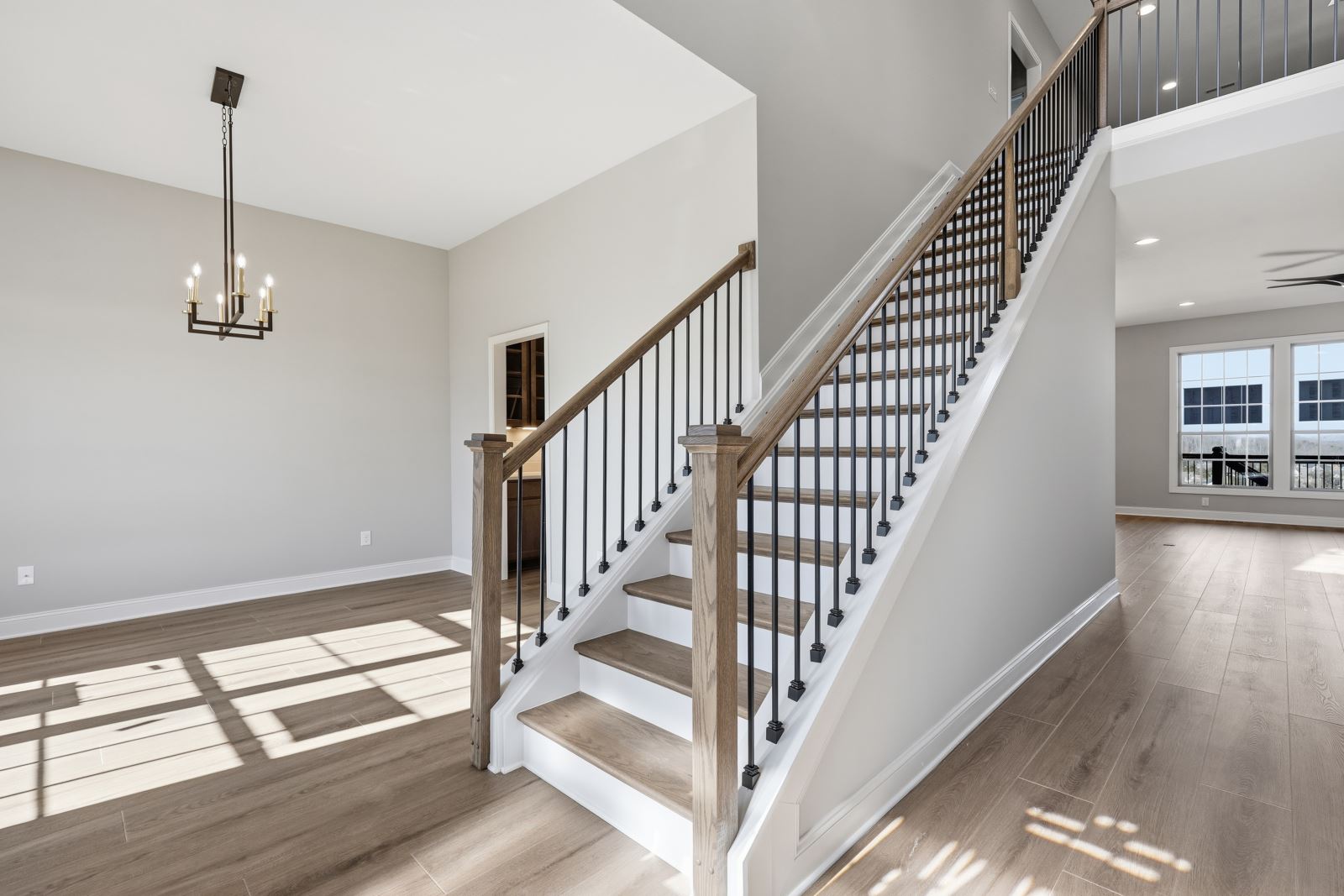 The Stockton offers a very open first floor layout with a large family room and flex area off the entry than can be utilized as a formal sitting area, home office, or more.  The family room with optional bookcases and fireplace is open to the kitchen which makes this plan ideal for entertaining.  Kitchen features include an island design and separate breakfast area, and adjoins the flex room via a hallway with a built-in butler’s pantry and separate utility room with folding counter.  The first-floor primary bedroom suite includes a large walk-in closet and linen closet, a garden tub, separate shower, and 6' double bowl vanity in the primary bath.  A covered patio with covered deck above is included at the rear of the home and sheltered by the first-floor primary bedroom and breakfast area wings of the house for maximum privacy. The garage opens to a mud room, powder room, and optional drop zone off the family room.  Three additional bedrooms, two full bath and a large central loft are located upstairs, with access to the spacious covered deck.  A 10’ wide unfinished attic storage is accessible from bedroom #3.
