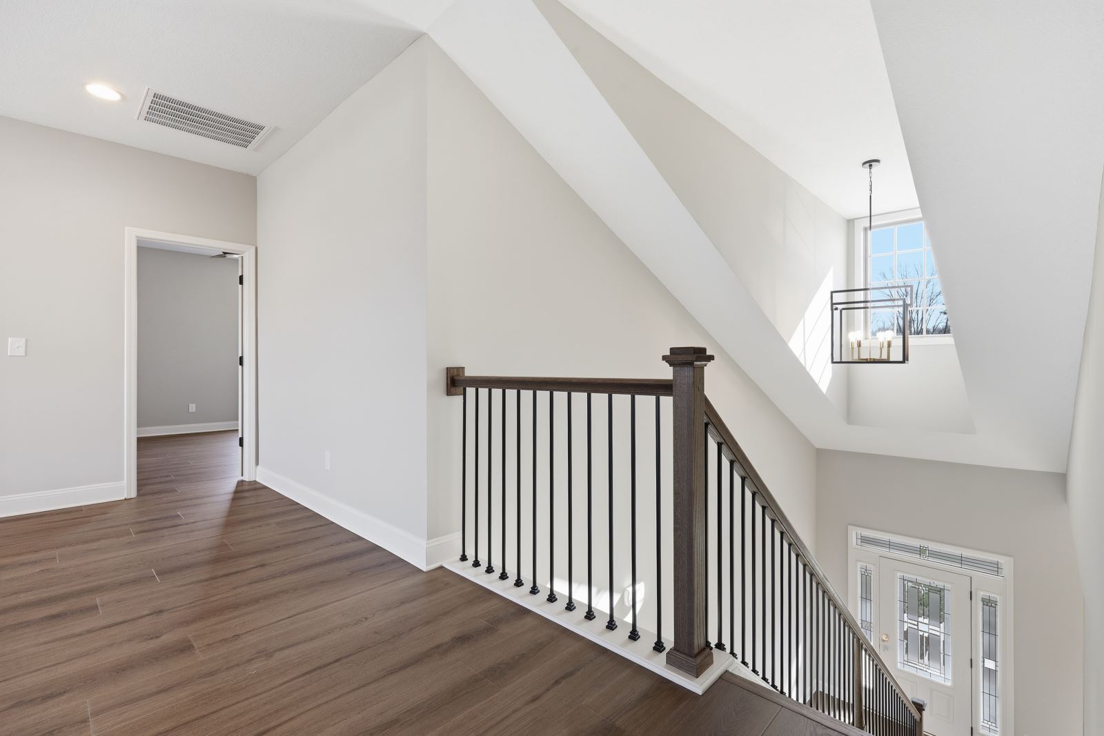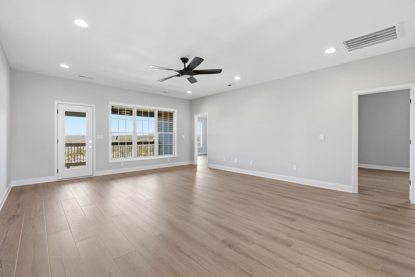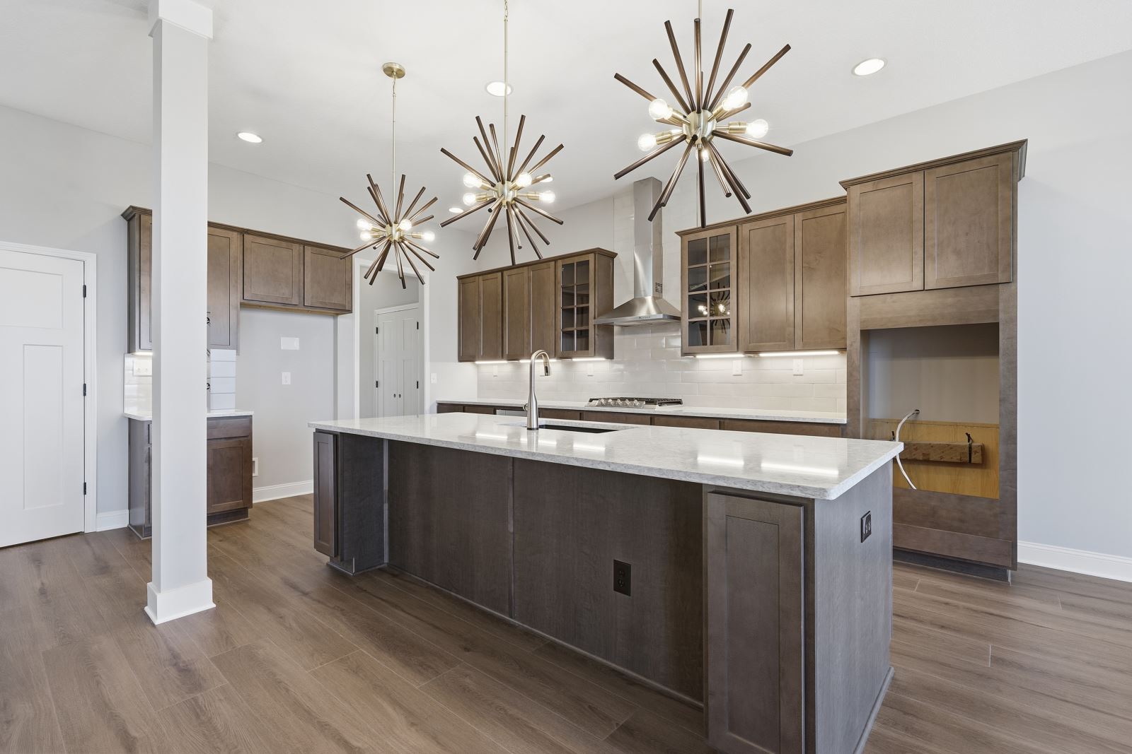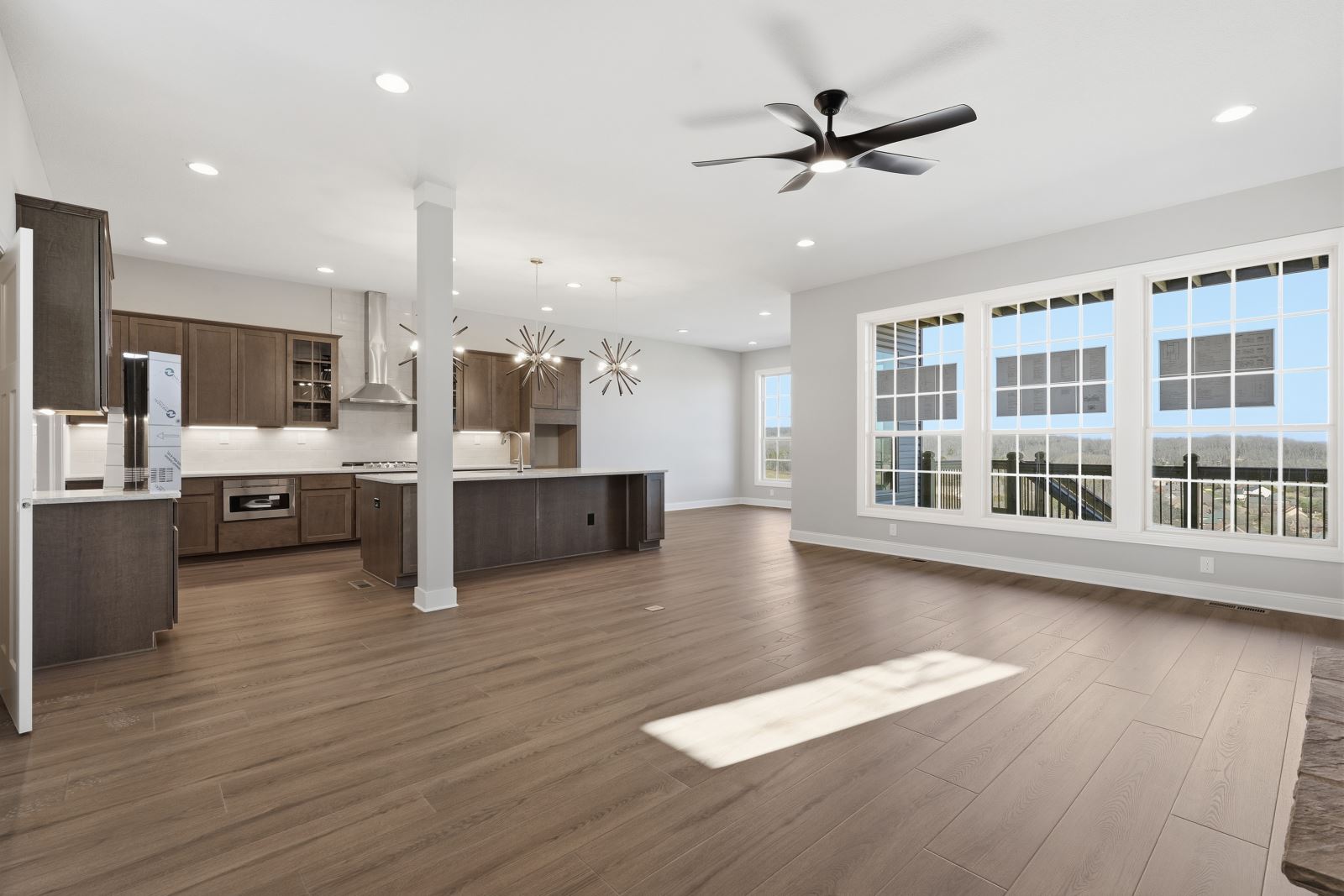 The Stockton offers a very open first floor layout with a large family room and flex area off the entry than can be utilized as a formal sitting area, home office, or more.  The family room with optional bookcases and fireplace is open to the kitchen which makes this plan ideal for entertaining.  Kitchen features include an island design and separate breakfast area, and adjoins the flex room via a hallway with a built-in butler’s pantry and separate utility room with folding counter.  The first-floor primary bedroom suite includes a large walk-in closet and linen closet, a garden tub, separate shower, and 6' double bowl vanity in the primary bath.  A covered patio with covered deck above is included at the rear of the home and sheltered by the first-floor primary bedroom and breakfast area wings of the house for maximum privacy. The garage opens to a mud room, powder room, and optional drop zone off the family room.  Three additional bedrooms, two full bath and a large central loft are located upstairs, with access to the spacious covered deck.  A 10’ wide unfinished attic storage is accessible from bedroom #3.