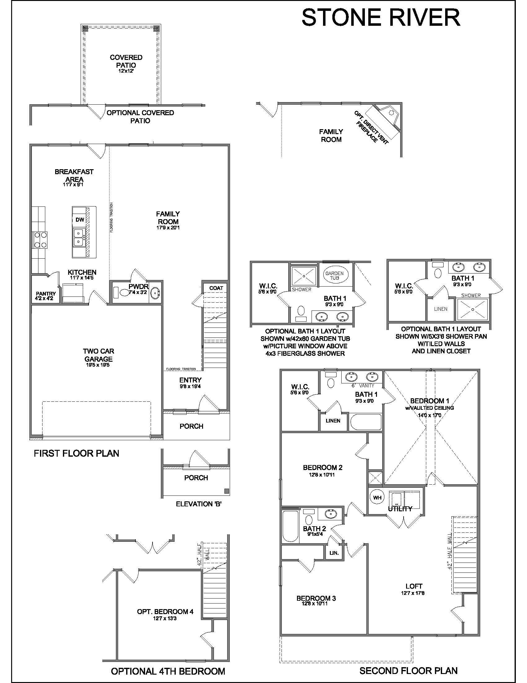 The Stone River, part of the Trend Collection by Ball Homes, is two story plan with an open first floor layout. The island kitchen offers both a breakfast area and countertop dining, and a large pantry. The kitchen opens to the family room at the rear of the home. Upstairs are the primary bedroom suite, two bedrooms and a hall bath, plus a spacious loft that can also be configured as a fourth bedroom option. The primary bedroom suite includes a bedroom with vaulted ceiling, large closet, and spacious bath with tub/shower, window, and linen storage. An upgrade bath offers a garden tub, separate shower, and picture window.